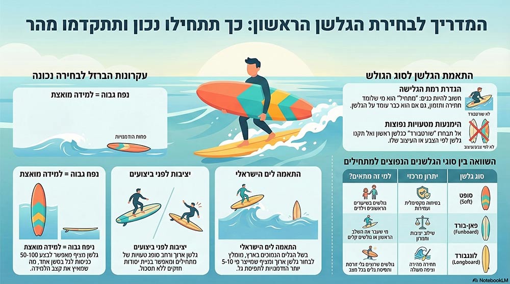 גלשן ראשון מתאים הוא הבסיס לכל מה שיבוא אחר כך. בחרו נפח גבוה, בחרו יציבות, התחשבו במשקל ובגובה והתאימו את הבחירה לים הישראלי. ובעיקר אל תהססו להתייעץ עם מדריך מנוסה.