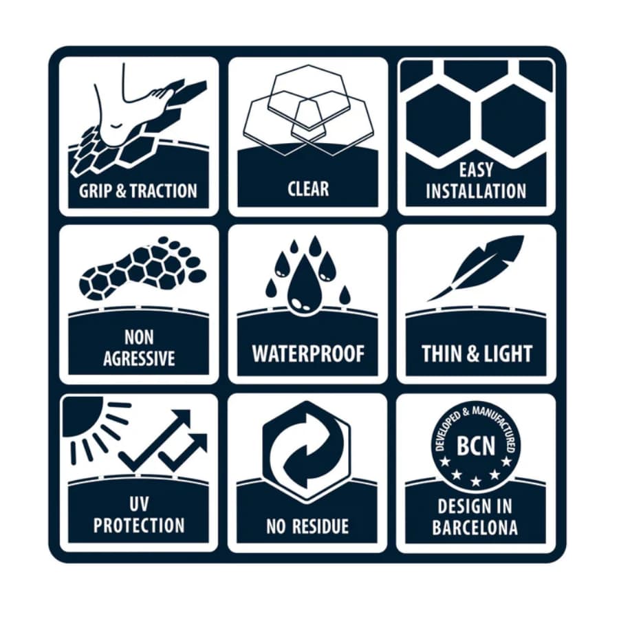 ה-HexaTraction של חברת RSPro מברצלונה הוא הסטנדרט הגבוה ביותר למשטחי אחיזה דקים. בזכות גאומטריה של משושים המאפשרת פריסה מותאמת אישית, המוצר מבטיח אפס ספיגת מים ושמירה על משקל נוצה של 115 גרם בלבד לקיט – נתון קריטי לגולשי פויל המבקשים מינימום גרר ואופטימיזציה של מרכז הכובד. הטקסטורה הייחודית מספקת אחיזה יציבה המונעת החלקה בביצועים אגרסיביים ובנחיתות (Touchdowns), תוך שהיא מגינה על הדק מפני קרינת UV. בניגוד לשעווה, החומר אינו נמס בשמש ואינו משאיר שאריות דביקות, מה שמבטיח “תחושת טיסה” נקייה וישירה בין כף הרגל לבורד.
